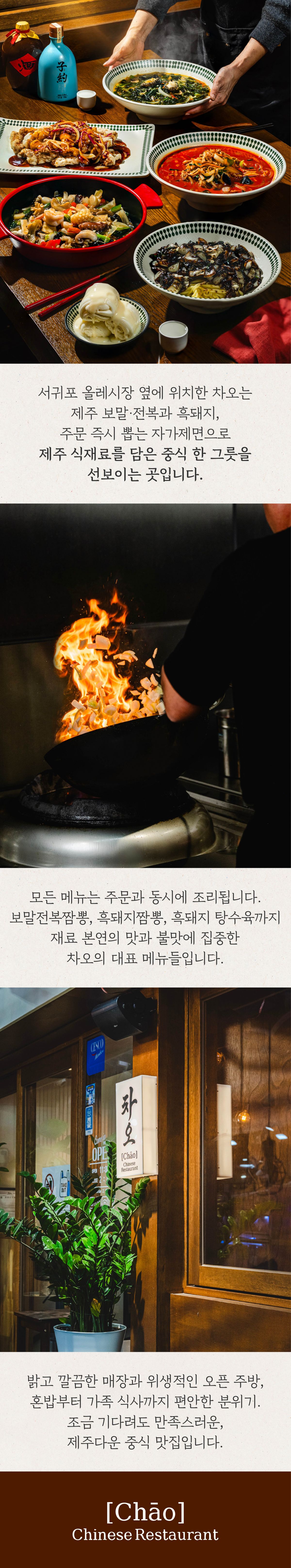 서귀포 올레시장에 문을 연 차오는 제주 바다의 보말&전복, 제주 흑돼지라는 제주 식재료, 그리고 주문 즉시 뽑는 자가제면으로 '제주에서만 맛볼 수 있는 중식'을 선보이는 서귀포 맛집입니다.